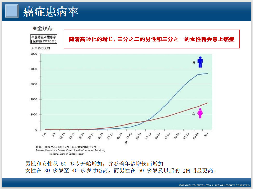佐藤院长提出根据日本国立癌症研究所统计,男性及女性主要是在50多岁随着年龄增长发病率逐渐显现,癌症发生概率呈现递增趋势,女性在30岁至40岁时候发病率略高,男性在60多岁之后比例较女性而言显著升高。