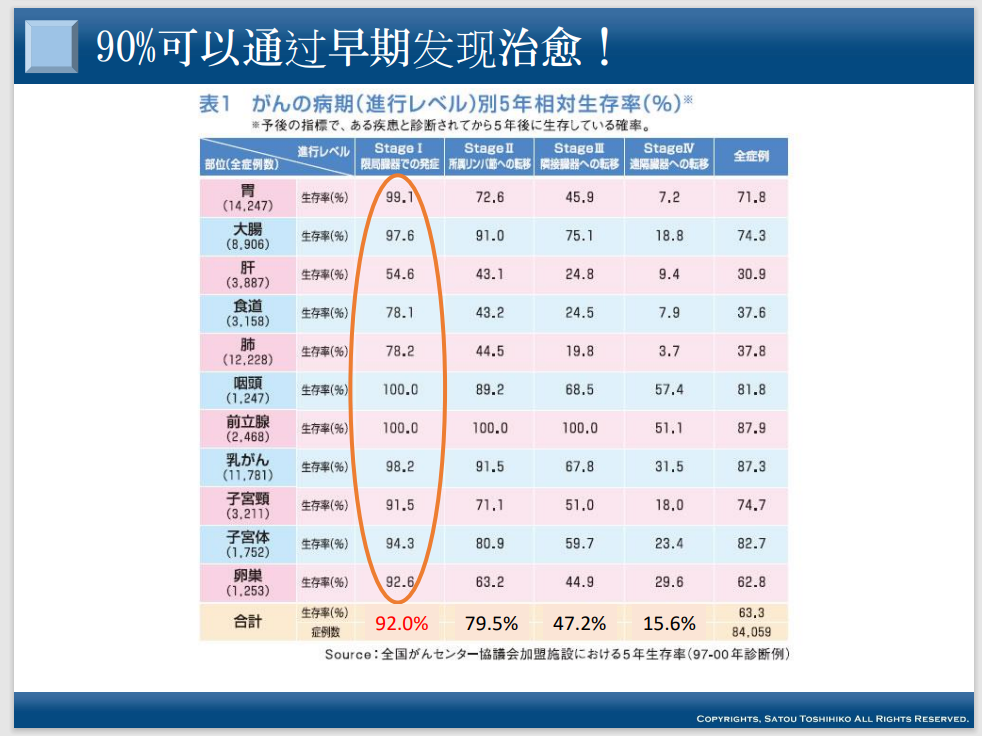 根据日本的研究数据表明,癌症早发现早治疗,癌症的5年生存率可以达到90%以上。