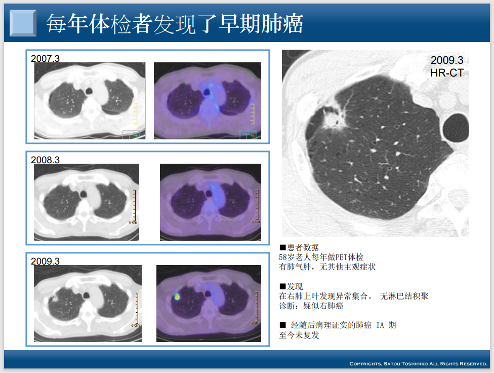 为了提倡每年体检的重要性,佐藤院长特意展示其医院一例患者因每年积极体检而发现的早期肺癌。